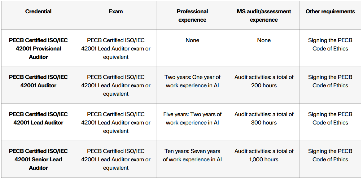 The requirements for PECB ISO/IEC 42001 Auditor certifications are as follows:
